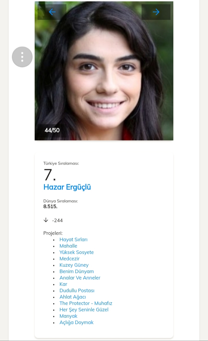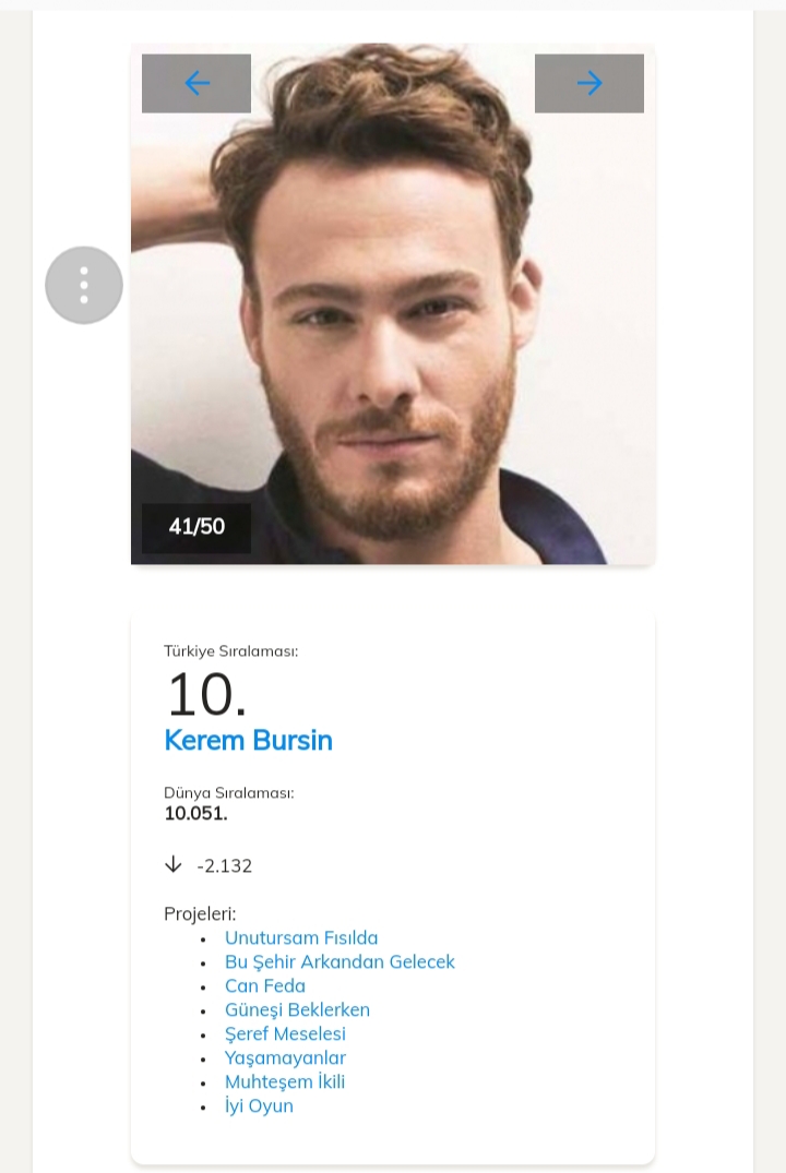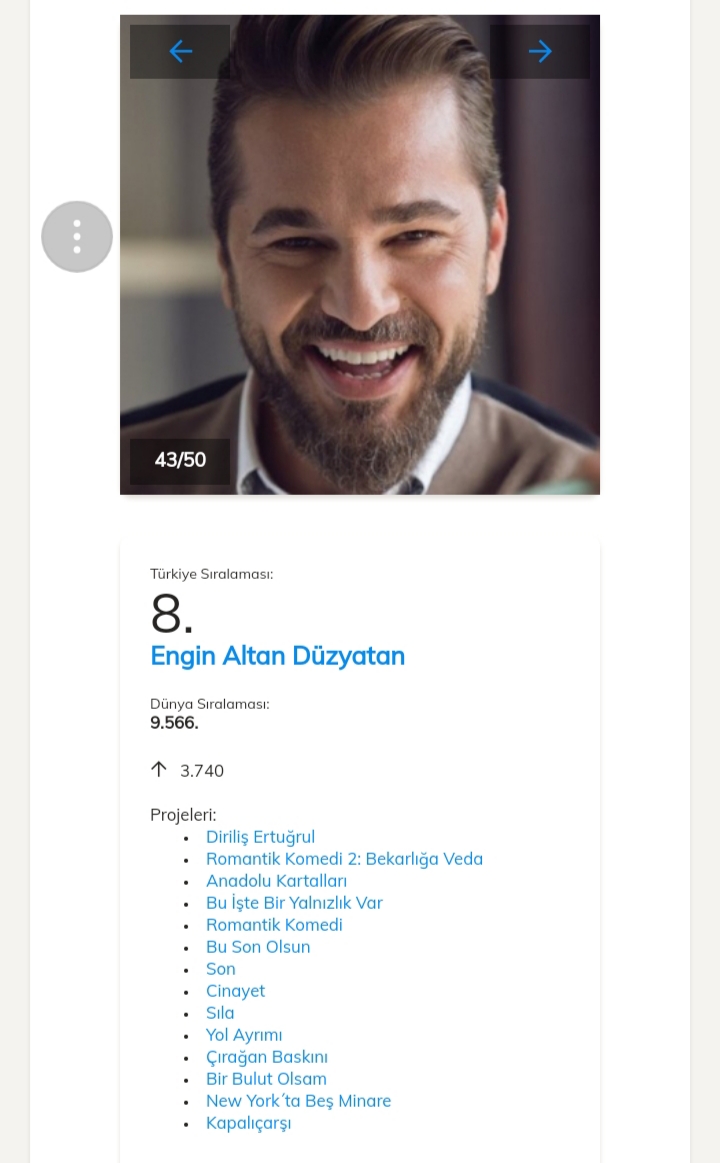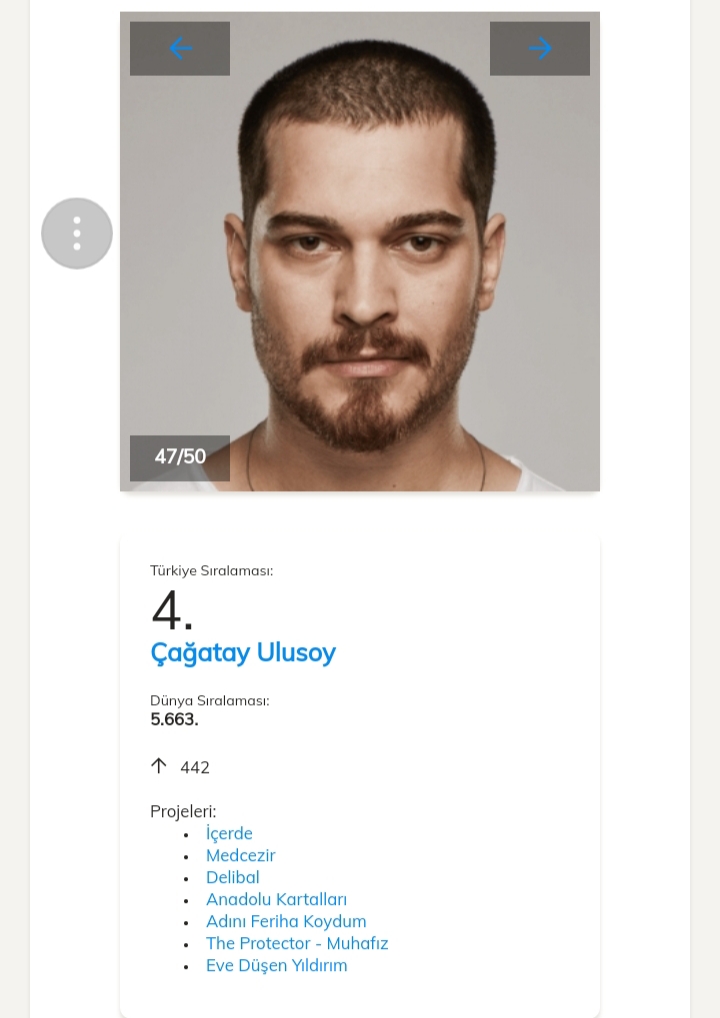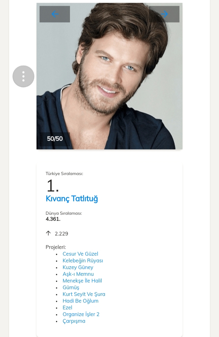 Pe locul 1 în clasamentul celor mai accesate date dintre actorii turci este Kivanç Tatlıtuğ cu o urcare de 2229 de poziții, el fiind pe locul 4361 în clasamentul mondial.Pe locul al 2- lea se află actrița Ayça Ayşin Turan.Al 3-lea loc este ocupat de actrița Yasemin Kay Allen .Pe locul 4 se află Cagatay Ulusoy.Pe locul al 5-lea se află Elçin Sangu.Vă ataşez mai jos link-ul unde puteți vedea restul clasamentului.