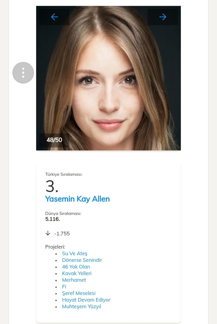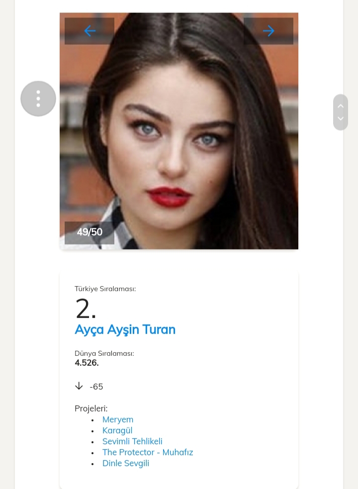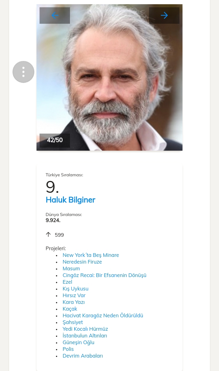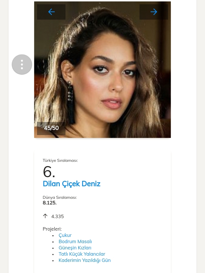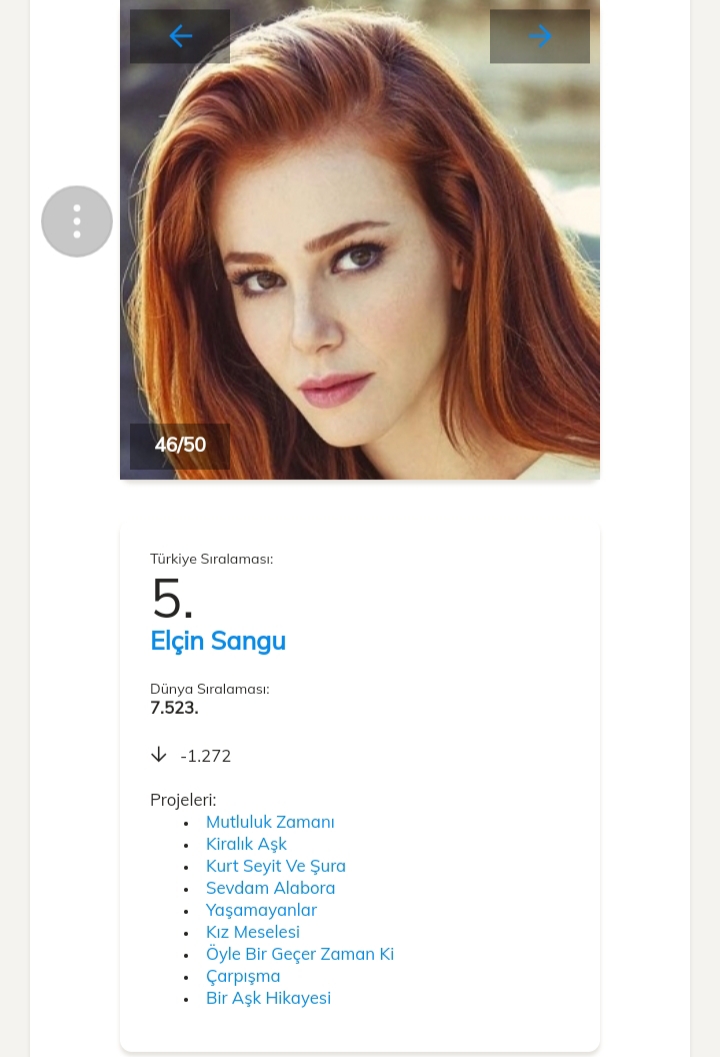 Pe locul 1 în clasamentul celor mai accesate date dintre actorii turci este Kivanç Tatlıtuğ cu o urcare de 2229 de poziții, el fiind pe locul 4361 în clasamentul mondial.Pe locul al 2- lea se află actrița Ayça Ayşin Turan.Al 3-lea loc este ocupat de actrița Yasemin Kay Allen .Pe locul 4 se află Cagatay Ulusoy.Pe locul al 5-lea se află Elçin Sangu.Vă ataşez mai jos link-ul unde puteți vedea restul clasamentului.