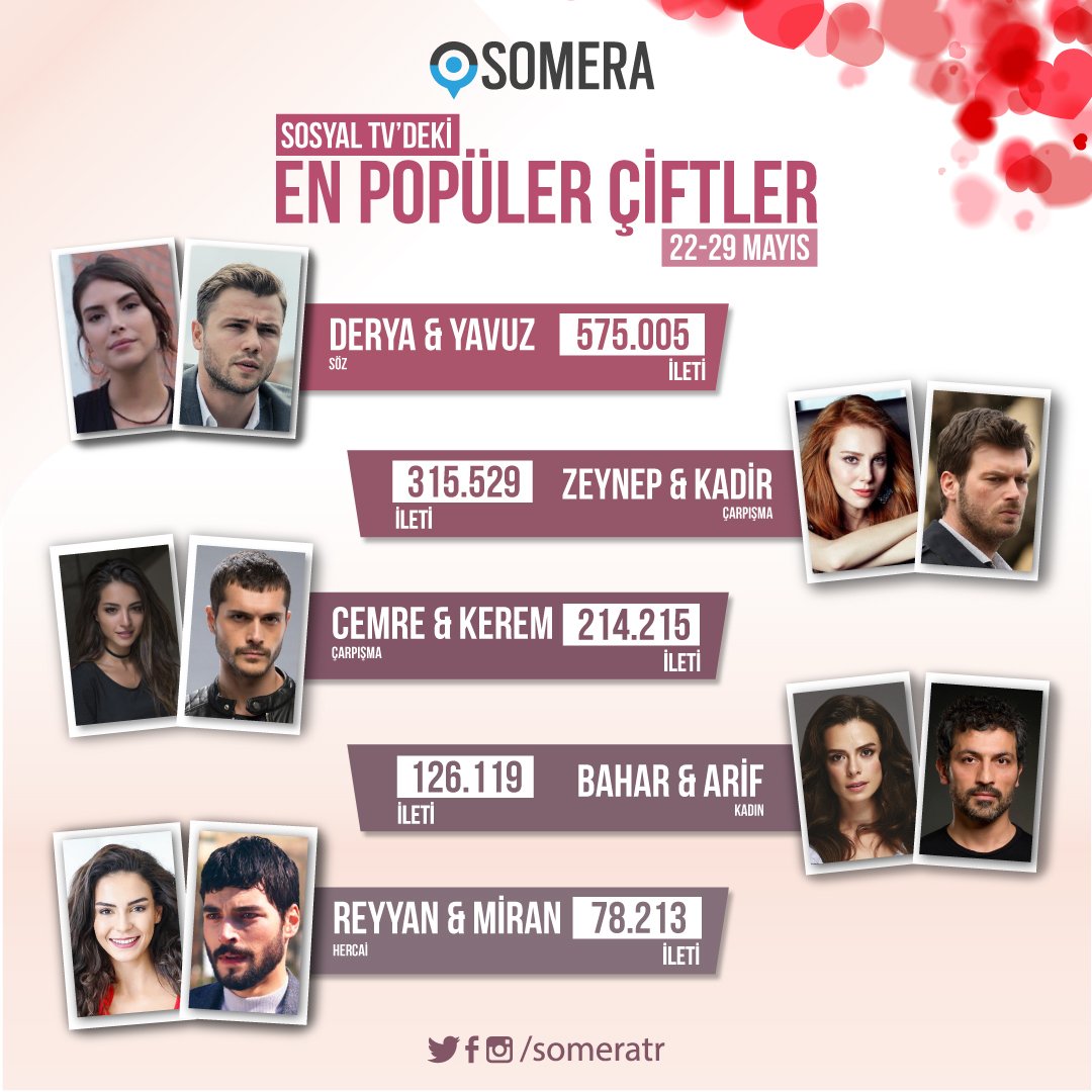 SOMERA (Servicii de măsurare, analiză şi cercetare în Social Media), a dat publicității clasamentul cu cele mai populare cupluri din seriale, în săptămâna 22-29 Mai.