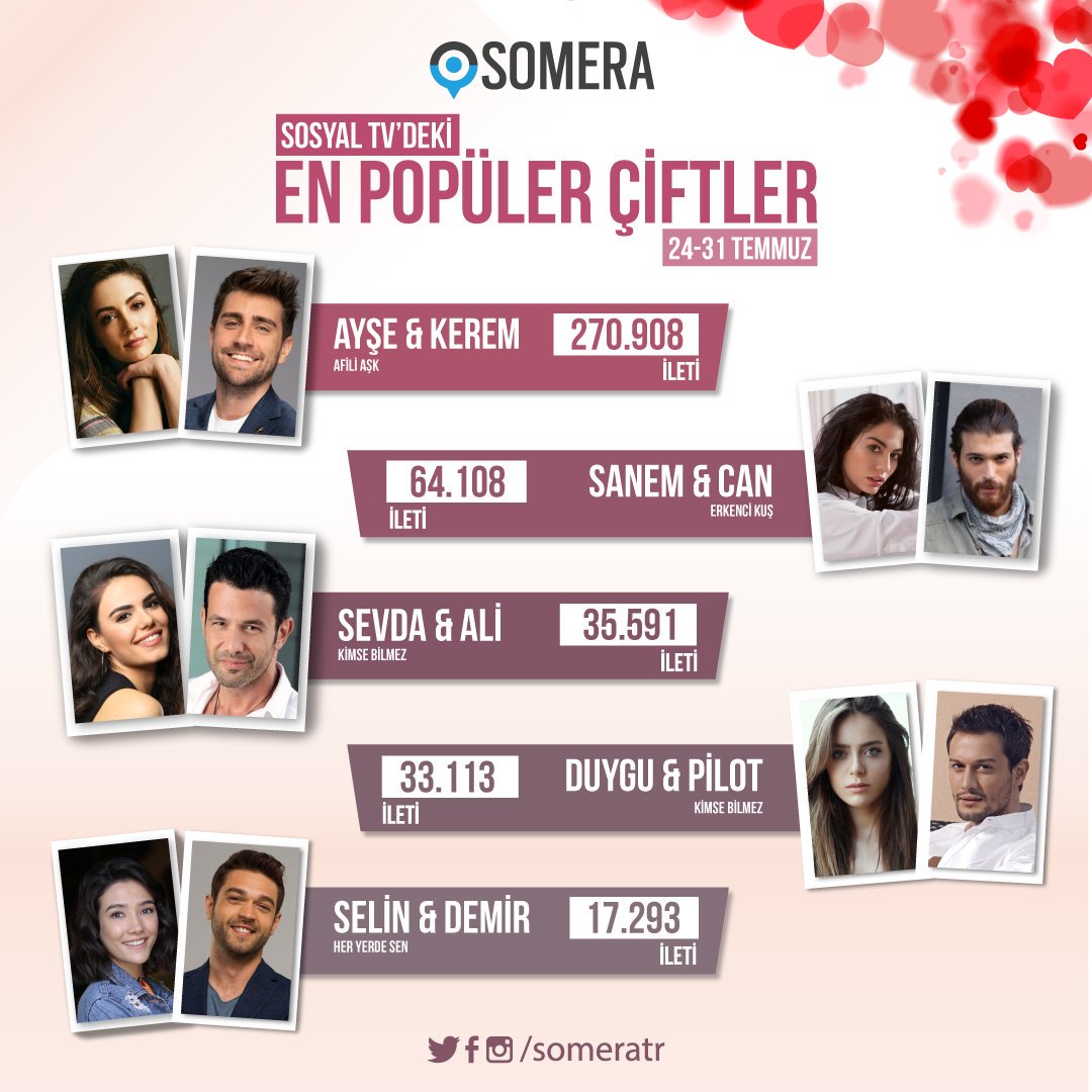 SOMERA (Servicii de măsurare, analiză şi cercetare în Social Media), a dat publicității clasamentul cu cele mai populare cupluri din seriale, în săptămâna 24-31 iulie.
