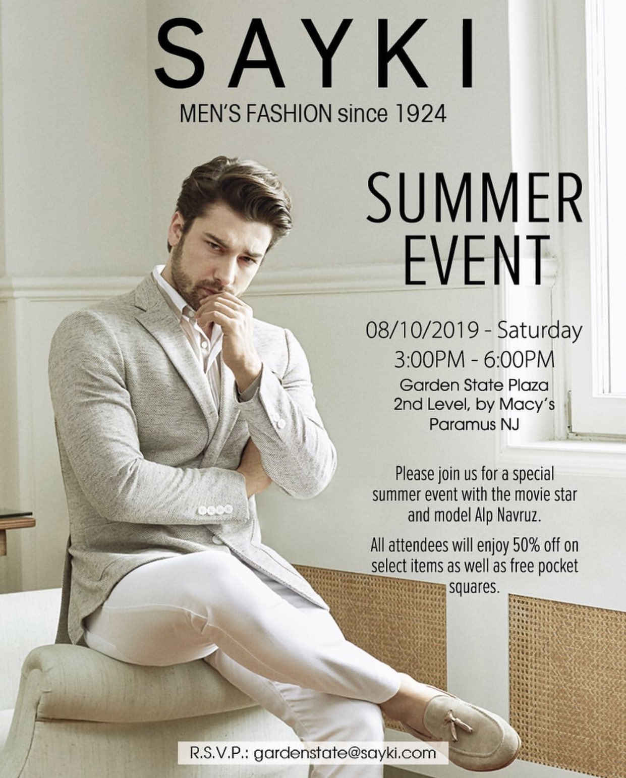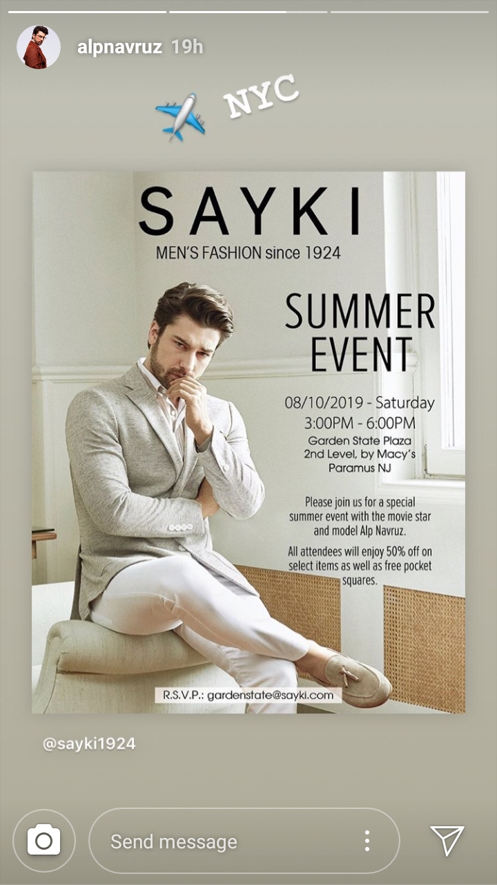Îndrăgitul actor Alp Navruz se află în Statele Unite ale Americii, iar mâine 10 August, este aşteptat la deschiderea unui nou magazin al brandului Sayki, el fiind imaginea colecției toamnă-iarnă.