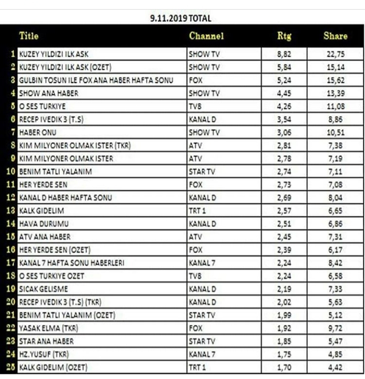 Şi în această săptămână serialul Kuzey Yıldızı ,,Ilk Aşk”/Steaua Nordului ,,Prima iubire”, ce îi are ca protagonişti pe Aslihan Güner şi İsmail Demirci, a fost lider de audiență la toate categoriile. Episodul difuzat în reluare, a fost pe locul al doilea la categoria TOTAL.
