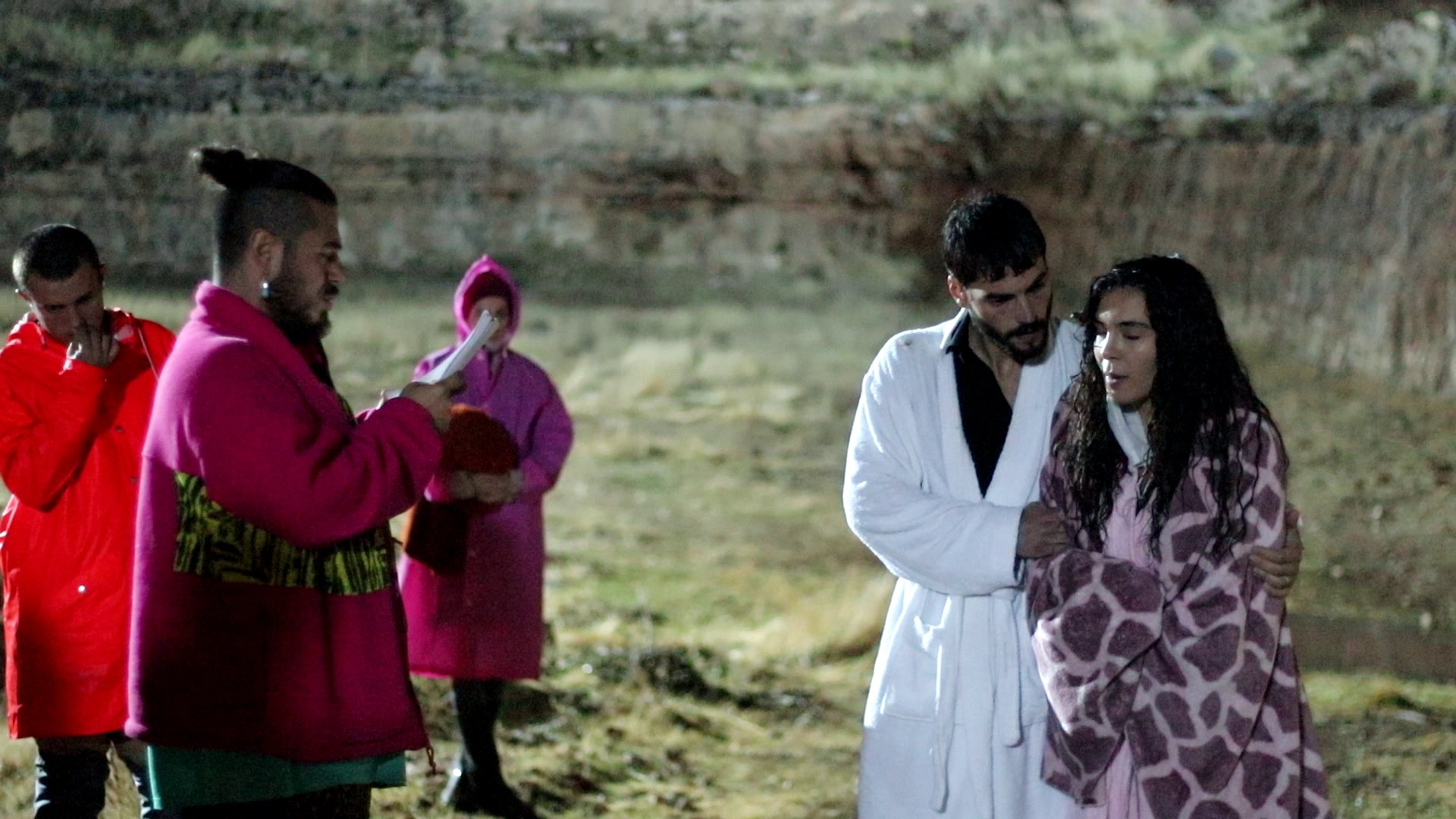 După ce filmările au luat sfârşit, actorii erau reci și s-au înfășurat într-o pătură, stând în jurul focului.