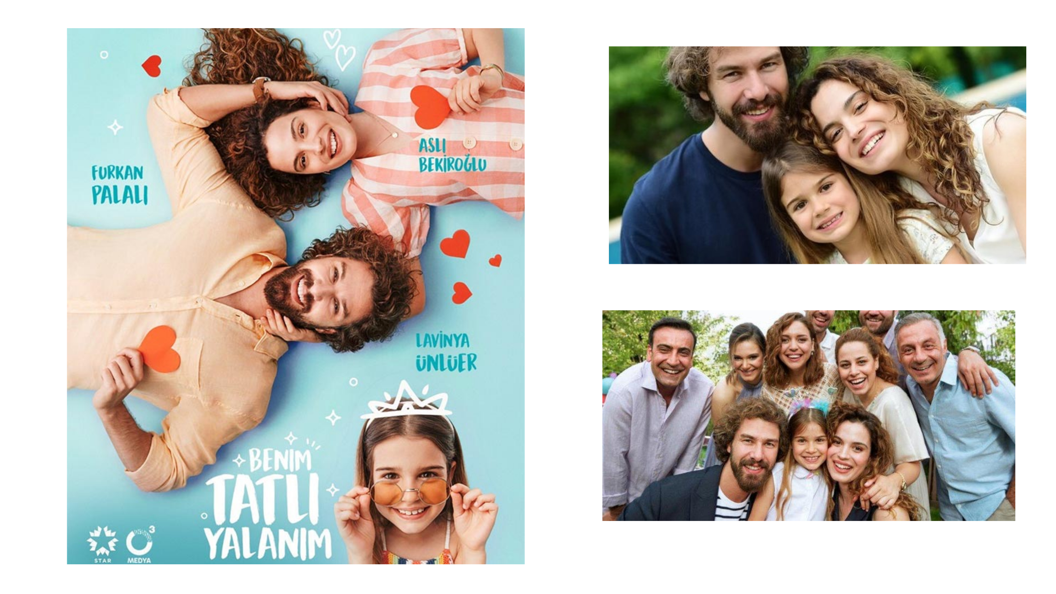 Benim Tatlı Yalanım îi are ca protagonişti pe Furkan Palalı (Nejat) , Aslı Bekiroğlu (Suna), Lavinya Ünlüer (Karya) şi este difuzat pe postul de televiziune turcesc Star Tv.